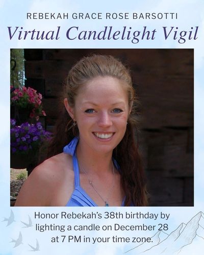 We will be having a virtual candlelight vigil on December 28, 2024, at 7:00pm in Honor and Memory of Rebekah Grace Rose Barsotti. It is Rebekah's Birthday! Please consider joining us when it is 7:00pm where you are. Rebekah may be gone from this earth as we know it but she is not forgotten. (If your schedule does not allow choose a time that works for you).